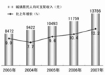 城鄉居民收入快速增長。5年來,我國農村居民人均純收入由2003年的2622元增加到2007年的4140元,城鎮居民人均可支配收入由8472元增加到13786元。在城鎮居民各項收入中,經營、財產性收入比重有所上升,成為城鎮居民收入增長的亮點,表明我國居民增收的可持續性不斷增強。