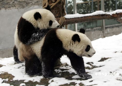 資料圖:贈(zèng)臺(tái)大熊貓團(tuán)團(tuán)、圓圓在雪地里嬉戲。 中新社發(fā) 王瑞林 攝