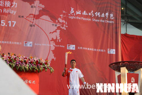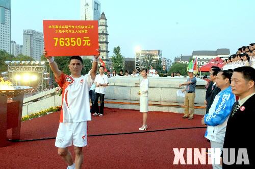 5月17日,最后一棒火炬手馬建明代表所有紹興傳遞的火炬手,將他們的捐款交給紹興市民政局。當(dāng)日,北京奧運(yùn)會(huì)圣火在浙江紹興傳遞。 新華社記者王小川攝