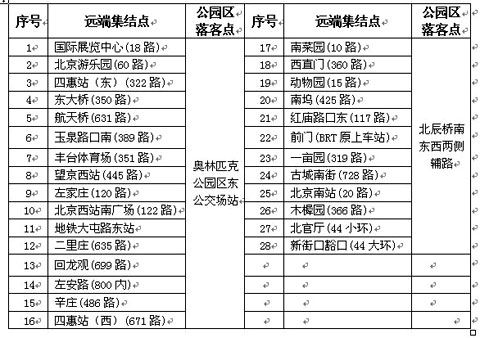 彩排結(jié)束后,觀眾可以乘坐開幕式公交專線返回,開幕式公交專線在東公交場站和北辰橋南兩側(cè)輔路發(fā)車,一站直達返回遠端集結(jié)點。同時,在28處遠端集結(jié)點安排90條常規(guī)公交線路擺車,與公交專線接駁,方便觀眾換乘。鑒于散場時大部分常規(guī)公交線路末車時間已過,為方便觀眾乘坐常規(guī)公交線路返回車返回,北京市交通運輸部門安排了部分常規(guī)公交線路在奧林匹克公園區(qū)周邊4處擺車。