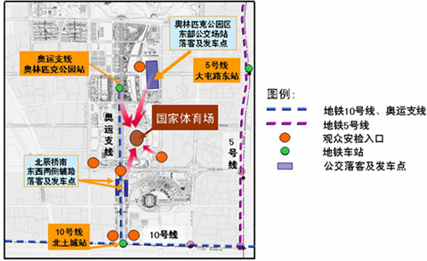 此外,觀眾也可以乘坐地鐵線抵達。一是乘坐地鐵10號線在北土城站出站,經(jīng)安檢后換乘8號線(奧運支線),直達奧林匹克公園站;二是乘坐地鐵5號線至大屯路東站,換乘開幕式公交專線到達奧林匹克公園區(qū)東公交場站。
