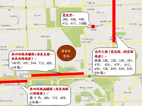 觀眾抵達奧林匹克公園區(qū)常規(guī)公交線路及車站分布圖