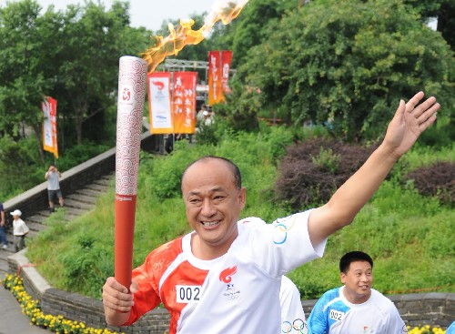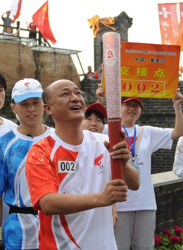 7月30日,火炬手聶瑞平手持火炬進(jìn)行傳遞。當(dāng)日,北京奧運(yùn)圣火在河北省秦皇島市傳遞。新華社記者 楊世堯攝