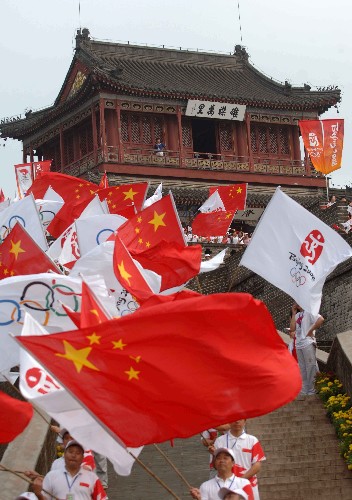 7月30日,人們?cè)诨鹁鎮(zhèn)鬟f起點(diǎn)老龍頭澄海樓前揮舞旗幟迎接圣火。新華社記者 鞏志宏 攝