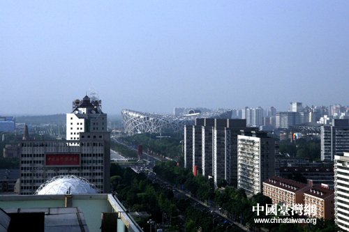 毗鄰鄰北三環的北京國際新聞中心頂樓成為記者取景的好地方,從高處望去,鳥巢好像近在咫尺。(攝影:李徽)
