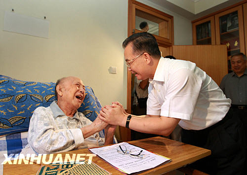 8月2日,中共中央政治局常委、國務院總理溫家寶專門看望為我國科技、文化、教育事業作出重要貢獻的季羨林、錢學森和何澤慧老人,向他們致以親切問候。這是溫家寶來到解放軍總醫院看望季羨林老人。 新華社記者 龐興雷 攝