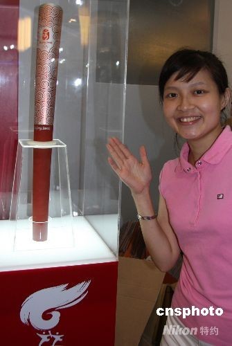 8月2日,由聯想集團設計的北京奧運會“祥云”火炬,在臺北電腦應用展聯想攤位現身。據介紹,這是“祥云”火炬真品首度來臺,只展出一天。 中新社發 董會峰 攝