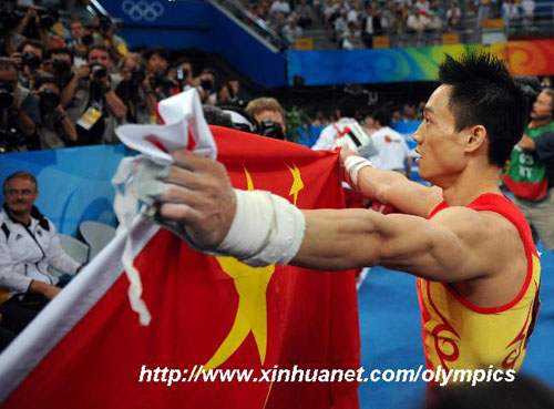 北京,2008年8月14日 (北京奧運)(1)體操——楊威!揚威! 8月14日,中國選手楊威在奪冠后手持五星紅旗慶祝。當日,在國家體育館舉行的北京奧運會男子個人全能決賽中,中國選手楊威以94.575分的成績奪得冠軍。 新華社記者程敏/攝
