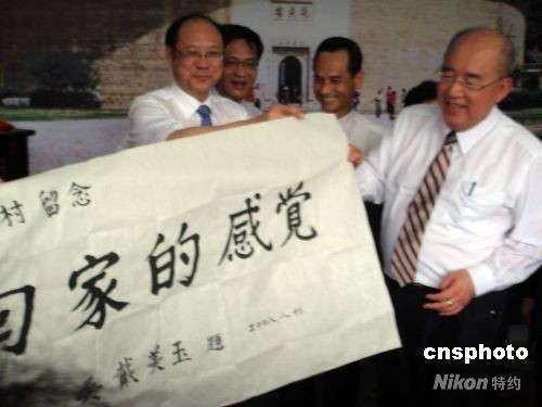 8月15日18時50分左右,中國國民黨主席吳伯雄結束赴閩謁祖之旅,乘周末包機從廈門直航返臺。圖為吳伯雄在他的家鄉福建永定縣下洋鎮思賢村展示其夫人的題詞,這正是他此行返鄉謁祖內心感受的真實寫照。 中新社發 陳悅 攝