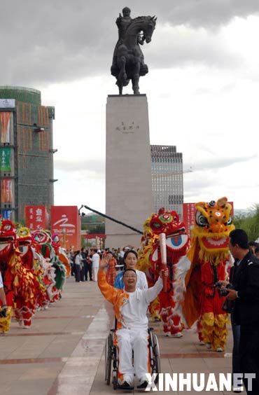 8月30日,火炬手王曉謙在傳遞火炬。當日,2008年北京殘奧會圣火在青城呼和浩特進行傳遞。 新華社記者金良快攝