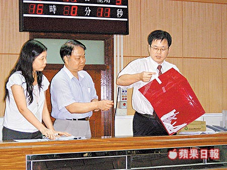 吳淑珍明天可能出庭,臺北地方法院庭長黃俊明(右)昨抽簽決定20名旁聽民眾。來源:臺灣《蘋果日報》