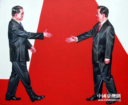 中國臺灣網(wǎng)11月10日北京消息 在海協(xié)會會長陳云林結束歷史性訪臺之際,藝術界也開始將目光集中在兩岸締造的歷史成就上。日前,素以刻畫政治人物而聞名的畫家馬堡中在北京展出了其2008年的一批最新作品。其中,一幅以中國共產黨中央委員會總書記胡錦濤與中國國民黨榮譽主席連戰(zhàn)在2005年“歷史性握手”為主題的油畫,成為各界關注焦點。