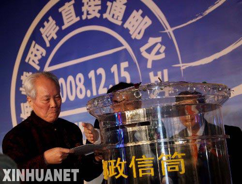 12月15日,今年81歲、出生在臺(tái)灣的鄭堅(jiān)老先生在兩岸直接通郵儀式上投寄出寄往臺(tái)灣的家書。 當(dāng)日,海峽兩岸直接通郵儀式在北京首都國(guó)際機(jī)場(chǎng)北京航空郵件交換站舉行。 新華社記者汪永基攝