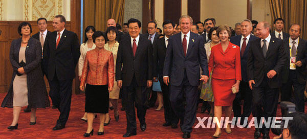 資料圖片 8月8日,中國國家主席胡錦濤和夫人劉永清為出席北京奧運會的貴賓舉行歡迎宴會。這是賓主步入宴會廳。(新華社記者樊如鈞攝)