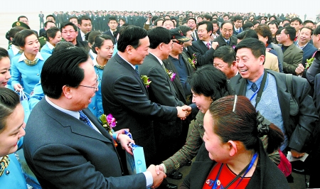 2月8日上午,省委書記徐光春、省委副書記陳全國等省領導,在鄭州新鄭國際機場為搭乘河南至臺灣空中直航首航包機的旅客送行。本報記者 陳 偉 攝