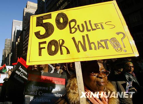 這是2006年12月16日,一名女子手舉抗議標(biāo)語(yǔ)參加在紐約第五大道舉行的抗議游行,標(biāo)語(yǔ)牌上寫(xiě)道:為什么要開(kāi)50槍?zhuān)慨?dāng)日,數(shù)千名美國(guó)民眾聚集在紐約第五大道舉行示威活動(dòng),抗議非洲裔美國(guó)人肖恩·貝爾上月遭警察無(wú)端射殺。在美國(guó),警察濫施暴力,侵犯公民權(quán)利。 新華社發(fā)