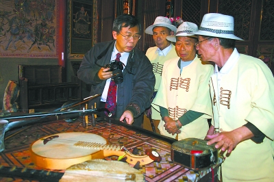 圖為與會(huì)學(xué)者(左)向泉港區(qū)北管藝人了解北管樂器。