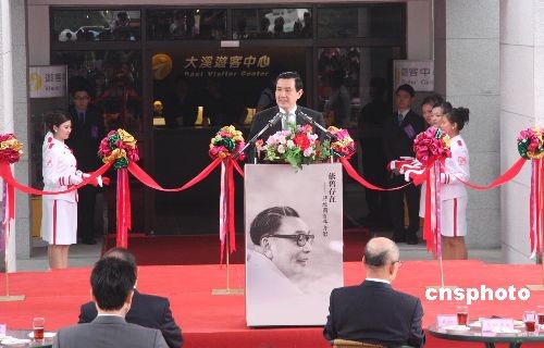 四月十三日,蔣經國百年誕辰紀念日,馬英九在桃園縣長朱立倫的陪同下來到大溪游客中心,出席在這里舉辦的“經國先生百年誕辰特展”。圖為馬英九在剪彩儀式上發表演講。 中新社發 耿軍 攝