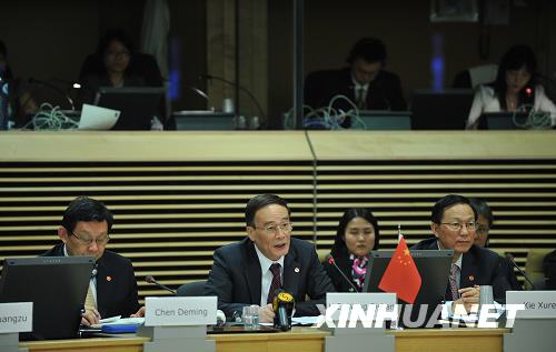 5月7日,在位于比利時首都布魯塞爾的歐盟總部,中國國務(wù)院副總理王岐山(前中)、中國商務(wù)部部長陳德銘(前左)和中國財政部長謝旭人(前右)出席當(dāng)天開幕的第二次中歐經(jīng)貿(mào)高層對話。新華社記者武巍攝