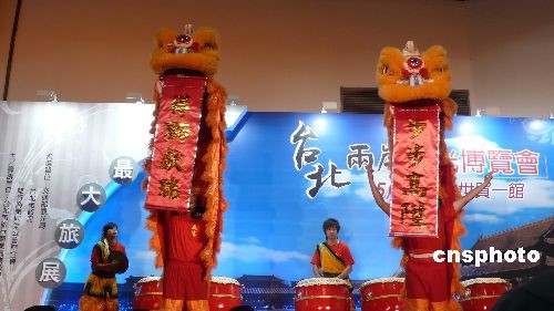 鑼鼓喧天的迎賓獅舞中,臺北兩岸觀光博覽會于臺北世貿(mào)一館開幕。來自大陸十一個(gè)省市的旅游業(yè)者在館內(nèi)積極向臺灣民眾推介大陸旅游資源。