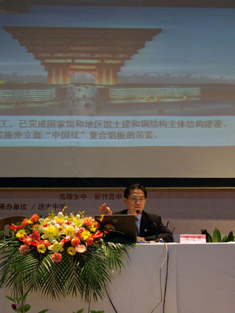 圖為周漢民在報告中介紹中國館的概況。葉辰亮 攝