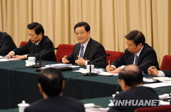 3月5日,中共中央總書(shū)記、國(guó)家主席、中央軍委主席胡錦濤參加十一屆全國(guó)人大三次會(huì)議江蘇代表團(tuán)的審議。新華社記者李學(xué)仁攝