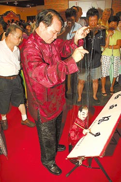 來自福建連城的木偶書法大師李明卿,在現場表演垂線木偶手寫書法絕技,看得現場民眾嘖嘖稱奇。(圖片來源:臺灣《中國時報》)