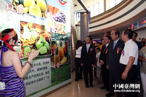 花蓮縣縣長(zhǎng)謝深山(中),海峽兩岸經(jīng)濟(jì)科技合作中心策劃部部長(zhǎng)袁塞冰(左一)等參觀“暢游臺(tái)灣主題館”(中國臺(tái)灣網(wǎng) 李徽 攝)
