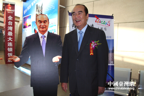 花蓮縣縣長(zhǎng)謝深山在主題館內(nèi)自己的“形象牌”前熱情為花蓮縣做推介(中國臺(tái)灣網(wǎng) 李徽 攝)
