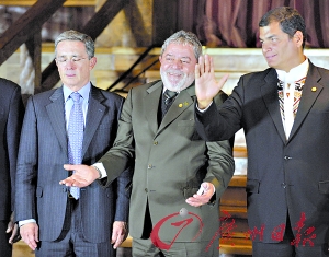 8月28日,哥倫比亞總統烏里韋(左)一臉疲憊。圖為烏里韋、巴西總統盧拉(中)與厄瓜多爾總統科雷亞在南美洲國家聯盟特別首腦會議上。