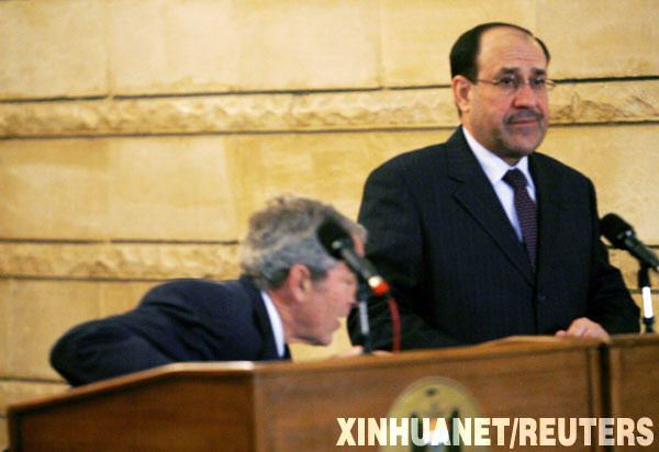 2008年12月14日,在伊拉克首都巴格達舉行的記者會上,美國前總統(tǒng)布什(左)彎腰躲避襲擊。當日,一名伊拉克記者在布什與伊拉克總理努里·馬利基(右)召開的聯(lián)合新聞發(fā)布會上脫下自己的鞋,扔向布什。 新華社/路透