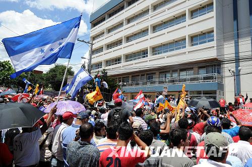 數(shù)千名塞拉亞支持者聚集在聯(lián)合國駐洪辦公室門前,迎接被罷免的總統(tǒng)歸來。