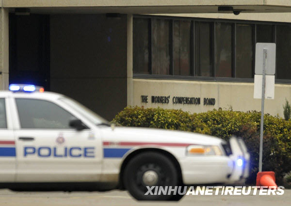 10月21日,一輛警車停在加拿大西部城市埃德蒙頓市工人賠償委員會大樓外。當天上午,一名男子手持步槍闖入該市工人賠償委員會大樓,劫持了數名人質。新華社/路透