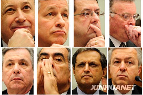 2月11日,獲得7000億美元“不良資產(chǎn)救助計劃”(TARP)的前八家銀行的CEO在華盛頓國會山出席美國國會眾議院金融委員會舉行的聽證會,就救助款項的去向進(jìn)行作證。圖為出席聽證會的富國銀行總裁兼CEO約翰·斯頓夫,花旗銀行CEO維克拉姆·潘迪特,摩根士丹利投資銀行總裁兼CEO約翰·麥克,道富銀行總裁兼CEO羅納德· 洛格(下排從右至左),美洲銀行總裁兼CEO肯·盧伊,紐約梅隆銀行總裁兼CEO羅伯特·凱利,摩根大通公司CEO詹姆斯·迪蒙,高盛公司CEO兼總裁勞埃德·布蘭克芬(上排從右至左)。新華社記者 張巖攝