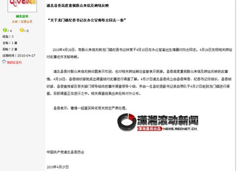 浦北縣縣委宣傳部韋副部長告訴瀟湘晨報記者,4月26日他們獲悉群眾反映龍門鎮(zhèn)紀委書記林某于20日在辦公室拿出生殖器對向女同志,在網(wǎng)上也看到了相關(guān)的帖文。浦北縣委對網(wǎng)上輿論監(jiān)督表示感謝,高度重視群眾來信及網(wǎng)站反映的此事,并在27日晚上公布了縣委相關(guān)決定。