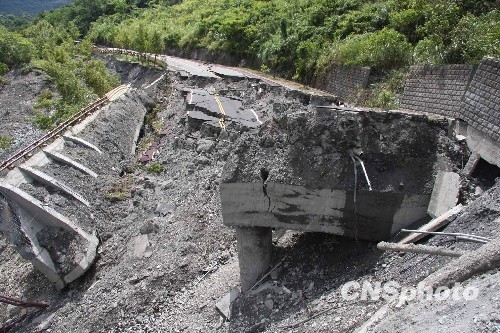 8月11日,中新社記者繼續(xù)涉險(xiǎn)踏訪臺東縣水患重災(zāi)區(qū),所見所聞、令人震撼。圖為延平鄉(xiāng)松楓大橋與公路聯(lián)結(jié)處,被沖垮、斜墜溪谷,“莫拉克”臺風(fēng)及洪水爆發(fā)的破壞力令人匪夷所思。 中新社發(fā) 董會峰 攝