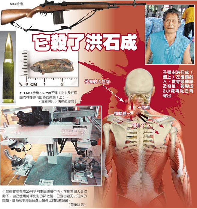 昨天結果出爐,初步認定洪石成遭M14射擊死亡,海監船上有7把類似步槍,經彈道比對,確定是其中一把射擊。M14步槍所用子彈屬大彈頭,有效射程在600米以上,威力強大。