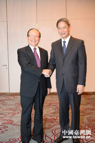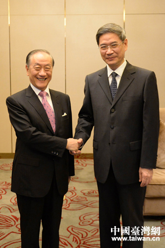中共中央臺辦、國務院臺辦主任張志軍近日在中山市會見了前來出席第二屆海峽兩岸中山論壇的新黨主席郁慕明。(中國臺灣網發)