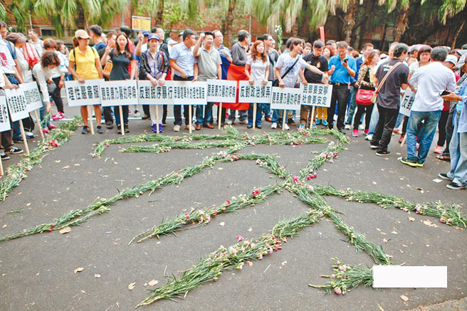 國民黨全臺青工總會29日在臺北舉辦“聽見康乃馨的呼喚”反反服貿(mào)活動,參加民眾在地上以康乃馨排出“家”的字樣。(圖片來自臺媒)