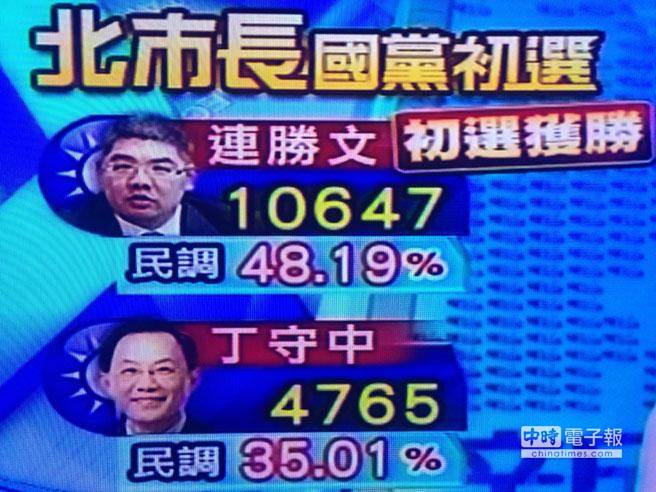 中國(guó)國(guó)民黨臺(tái)北市黨部今晚宣布,連勝文以民調(diào)27.8分、黨員投票20.38分的成績(jī),合計(jì)48.19分的成績(jī),擊敗包括立委丁守中、蔡正元及臺(tái)北市議員鍾小平等3名候選人勝出。