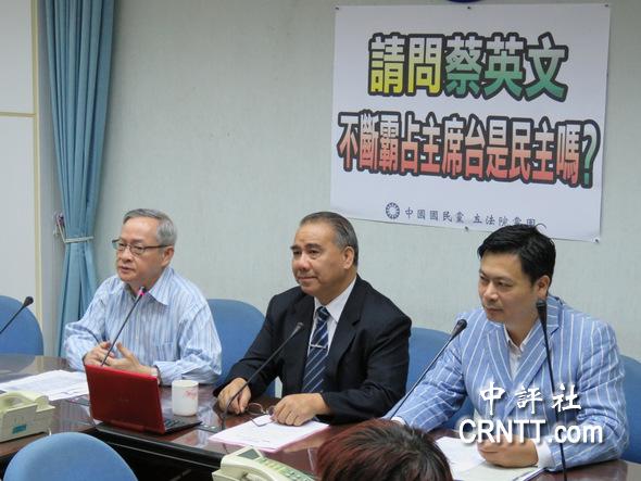 國民黨“立院”黨團書記長廖國棟、“立委”林郁方、吳育仁舉行“請問蔡英文,不斷霸占主席臺是民主嗎?”記者會,質疑蔡英文說一套做一套。