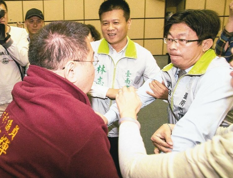 臺(tái)南市議會(huì)藍(lán)綠議員,在議事廳爆發(fā)激烈推擠。左為國(guó)民黨議員蔡育輝,右為民進(jìn)黨議員郭國(guó)文。