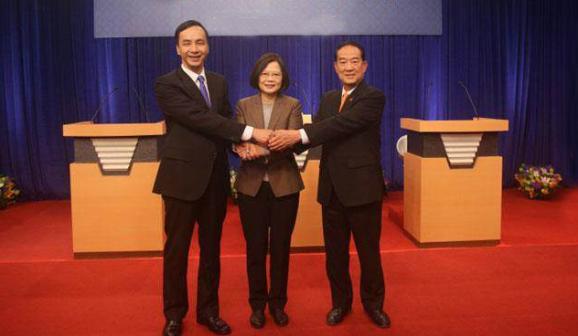 首場(chǎng)2016候選人電視政見發(fā)表會(huì)25日晚間時(shí)舉行,親民黨宋楚瑜(右起)、民進(jìn)黨蔡英文、國(guó)民黨朱立倫依序發(fā)言。(圖片取自臺(tái)灣中時(shí)電子報(bào))
