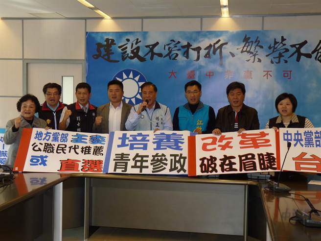 臺(tái)中市國(guó)民黨籍“立委”江啟臣(右三)、顏寬恒(左四)及臺(tái)中市議會(huì)國(guó)民黨團(tuán),今天召開記者會(huì)炮打國(guó)民黨中央,提出三大訴求。圖片來源:臺(tái)灣“中時(shí)電子報(bào)”