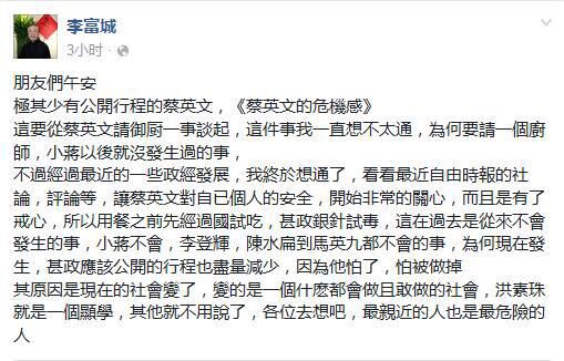 李富城在文中稱,一直想不通蔡英文為何要自費請廚子,不過經過最近的一些政經發(fā)展,才搞清楚了。李富城稱,看看最近的《自由時報》的社論、評論等,蔡英文對個人安全開始非常的關心,而且是有了戒心,所以用餐之前要先經過試吃,甚至銀針試毒。李富城稱,這在蔣經國、李登輝、陳水扁以及馬英九時代都不會發(fā)生的事情,現(xiàn)在發(fā)生在蔡英文時代,“因為她怕了,怕被做掉”,甚至應該公開的行程也盡量減少了。