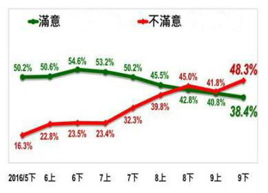據(jù)臺媒報(bào)道,島內(nèi)“指標(biāo)民調(diào)”調(diào)查民眾對蔡英文執(zhí)政滿意度,最新結(jié)果顯示,38.4%受訪者表示滿意,48.3%不滿意。對照9月上旬的民調(diào),不滿意度增加6.5%,進(jìn)一步加劇呈現(xiàn)“死亡交叉”。
