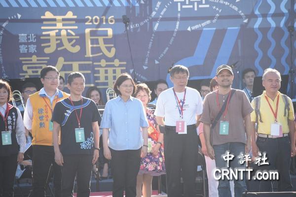 柯文哲(右起第3位)舉行客家義民嘉年華挑擔踩街,蔡英文(右起第4位)來捧場。(照片來自中評社,由由臺北市政府提供)