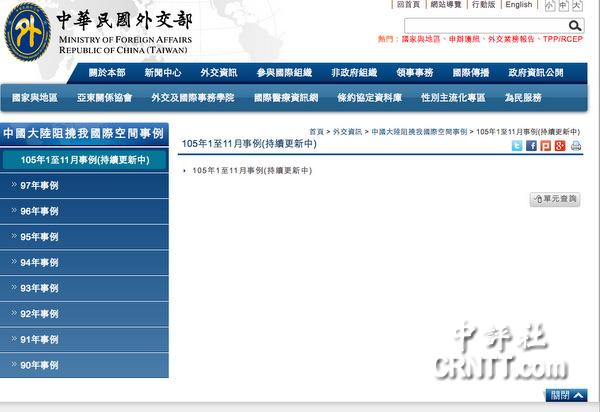 據(jù)悉,陳水扁執(zhí)政時期,臺外事部門即在官方網(wǎng)站上刊出“大陸阻撓我國際空間事例”。而馬英九上任后就再未公開過,相關(guān)網(wǎng)頁也一直空白至今。
