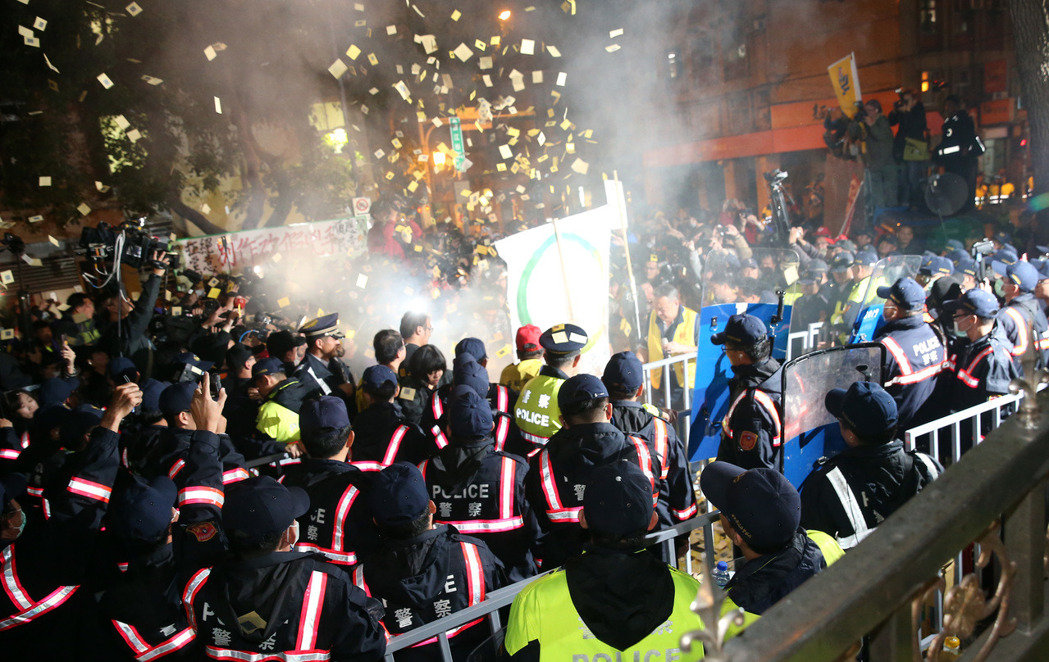 消息傳到議場(chǎng)外,從一早就開(kāi)始抗議的勞工團(tuán)體聽(tīng)聞“院會(huì)”內(nèi)逐條表決“勞基法”,便開(kāi)始憤怒沖撞、推擠警方人墻,并朝“立法院”內(nèi)丟煙霧彈、揚(yáng)撒大量冥紙抗議,表示要送民進(jìn)黨“上路”。