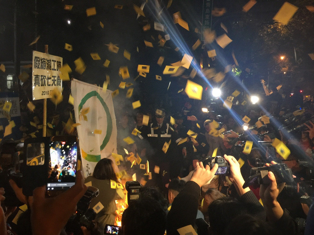 據(jù)報道,場外抗議的勞工團體得知消息后,現(xiàn)場先是彌漫低氣壓,隨即轉為憤怒,大喊“民主進步,過橋(指奈何橋)。點亮臺灣,過橋”。抗議群眾氣憤丟執(zhí)煙霧彈,并燃燒蔡英文競選時“點亮臺灣”的旗幟,更揚撒大量冥紙,表示要送民主進步“上路”。勞團高喊“無恥蔡‘政府’,砍假拼經濟”,嗆聲“如果民進黨這么愛錢,我們就燒給他們”,隨即高喊“過橋了”。